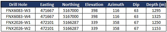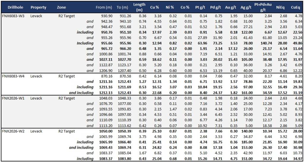 The four diamond drill holes in today’s press release were designed to test the depth potential of the R2 target area below the mineralization intersected in previously released holes FNX6038-W1 and FNX6038-W2 (see news releases dated August 28, 2025 and October 23, 2025). Drillholes FNX6083-W4 and FNX6083-W3 are additional wedge holes drilled from the same surface drill hole platform and were successful in extending the mineralization at depth by 25 metres and 75 metres below FNX6083-W1, respectively. Of note, drillhole FNX6038-W3 encountered a total of nine mineralized intervals between 930 metres and 1,207 metres down hole, with intercepts ranging from 0.3 metres to 3.2 metres and including 18.6% Cu, 15.4 g/t Au, 20.0 g/t Pd, 3.0 g/t Pt, and 105 g/t Ag over 0.6 metres. Drillhole FNX6083-W4 encountered two closely spaced veins which returned 12.3% Cu, 1.3% Ni, 6.7 g/t Pt, 13.9 g/t Pd, 1.6 g/t Au, and 78.9 g/t Ag over 1.3 metres.