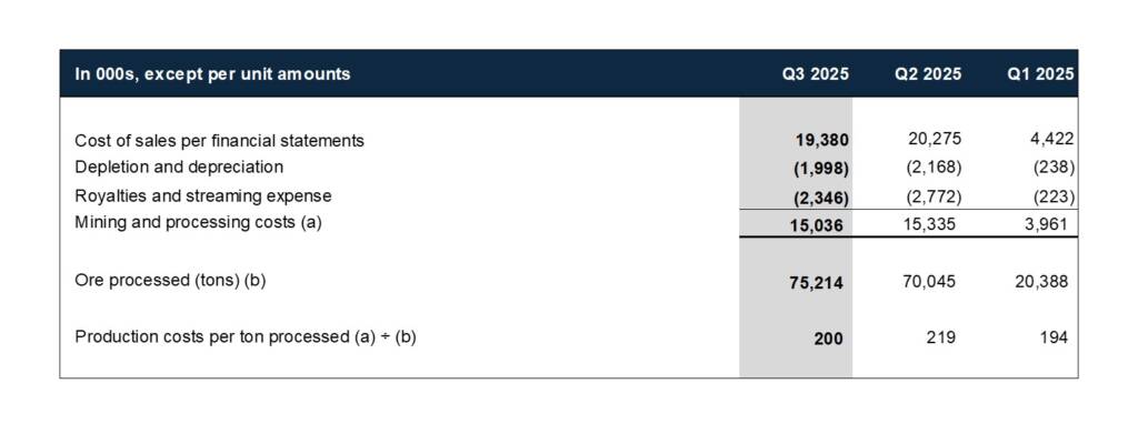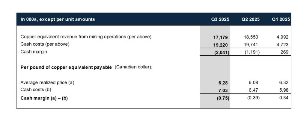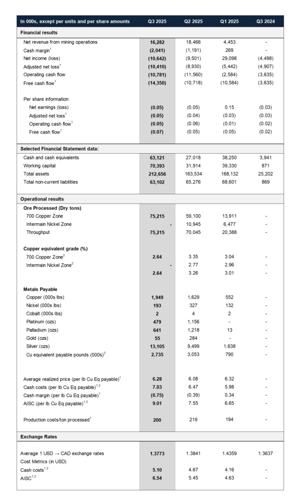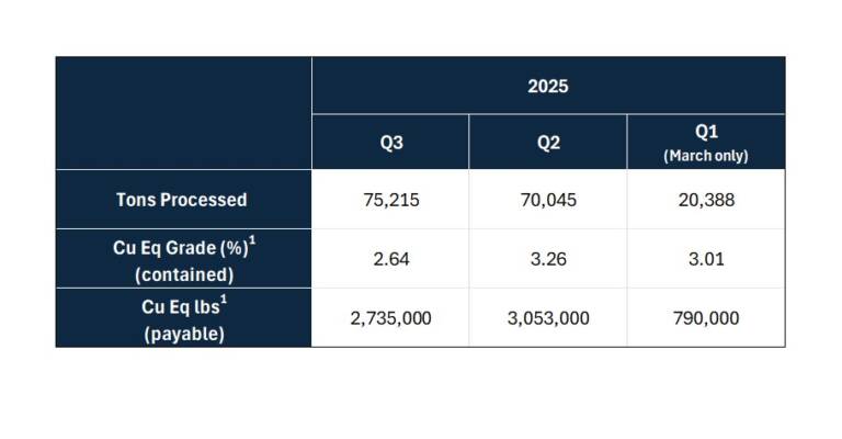 - Total ore processed in Q3 2025 was 75,215 tons from the 700 Footwall Copper Zone (see news release dated October 22, 2025) at a grade of 2.64% copper equivalent (“CuEq”)1.