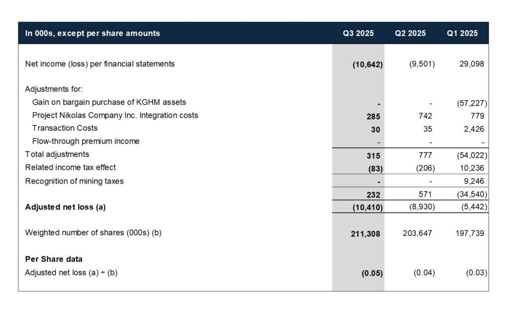 Adjusted net loss and adjusted net loss per share are non-IFRS Accounting Standards performance measures and do not constitute a measure recognized by IFRS Accounting Standards and do not have standardized meanings defined by IFRS Accounting Standards, as well both measures may not be comparable to information in other issuers’ reports and filings. Adjusted net loss is calculated by removing the one-time gains and losses resulting from the disposition of non-core assets, non-recurring expenses and significant tax adjustments (mining tax recognition and exploration credit refunds) not related to current period’s income, as detailed in the table below. Magna discloses this measure, which is based on its financial statements, to assist in the understanding of the Company’s operating results and financial position.
