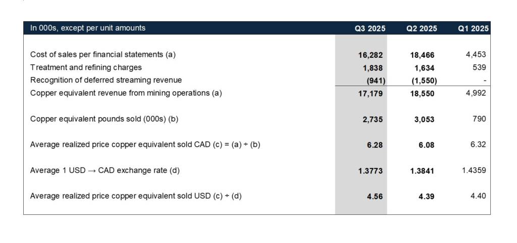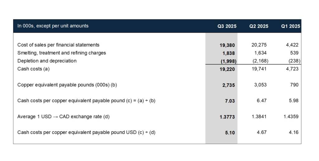 - Q3 cash costs were $7.03/lb CuEq, or US$5.10/lb CuEq.