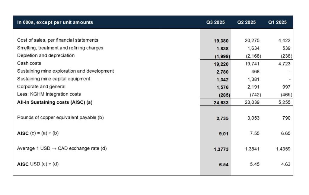 - Q3 all in sustaining costs (“AISC”) were $9.01/lb CuEq, or US$6.54/lb CuEq, which includes $4.1 million of sustaining mine capital development, equipment, and exploration, a 123% increase from the previous quarter.