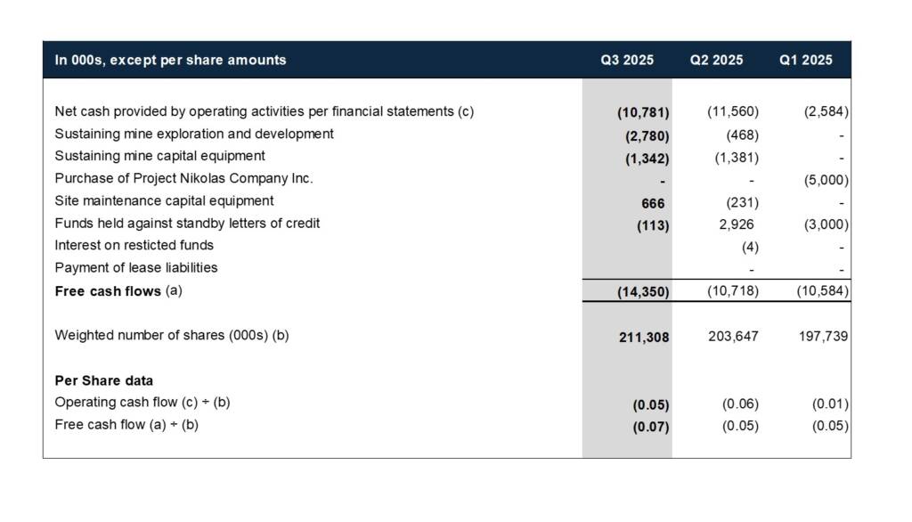 - Sustaining capital expenditures at McCreedy West totalled $4.1 million during the quarter, a 123% increase from Q2 of 2025, including $2.7 million towards critical capital development and $1.4 million in fixed and mobile machinery upgrades, focused on improving asset reliability moving forward.