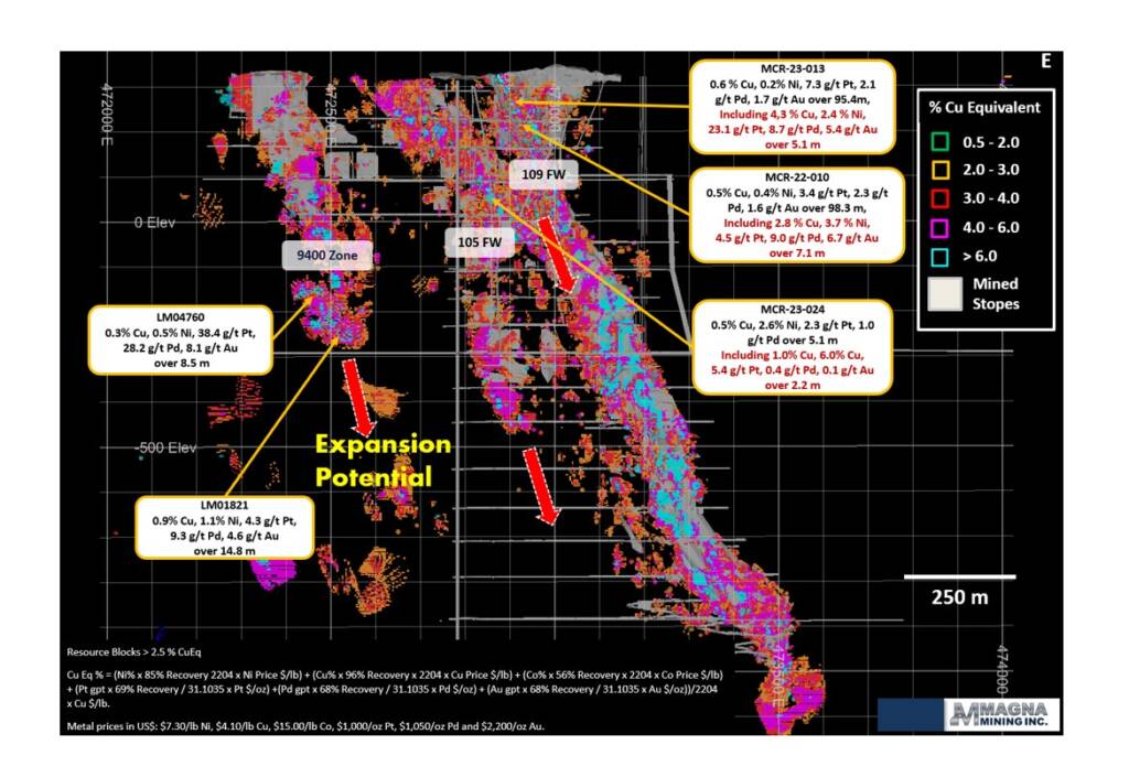 The majority of Mineral Resources at Crean Hill are contact nickel (“Ni”)-copper (“Cu”) zones but also include lesser amounts of Footwall (“FW”) Cu-Ni-precious metals including platinum (“Pt), palladium (“Pd”), gold (“Au) and silver (“Ag”) resources such as the 109 FW and 9400 Zones. At Crean Hill, the footwall Cu-precious metal systems consist of semi-massive vein to stringer and disseminated chalcopyrite rich sulphides within a Sudbury Breccia host rock extending into the footwall environment. The footwall mineralization is enriched in copper and precious metals in comparison to the contact Ni-Cu zones. Example footwall intersections include MCR-22-013 in the 109 FW Zone Mineral Resource which intersected 0.6% Cu, 0.2% Ni, 11.0 g/t Pt+Pd+Au over 95.4 metres, including a high grade massive sulphide interval grading 4.3% Cu, 2.4% Ni, 23.1 g/t Pt, 8.7 g/t Pd and 5.4 g/t Au over 5.1 metres, and drillhole LM04760 intersecting 0.3% Cu, 0.5% Ni, 38.4 g/t Pt, 28.2 g/t Pd, 8.1 g/t Au over 8.5 metres in the 9400 FW zone (Figure 3). Both the 109 FW Zone and the 9400 FW Zone have been drill-tested in the near surface environment above approximately the 600 metre level and remain open for expansion down-plunge.