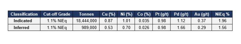 Please see notes on Mineral Resource assumptions, at the end of this release, including metal prices and recoveries used. The underground cut-off grade of 1.10% NiEq considers metal prices of $8.50/lb Ni, $3.75/lb Cu, $17.00/lb Co, $950/oz Pt, $1100/oz Pd and $1,950/oz Au, metal recoveries of 78% for Ni, 95.5% for Cu, 56% for Co, 69.2% for Pt, 68% for Pd and 67.7% for Au, a mining cost of US$80.00/t rock and processing, treatment and refining, transportation and G&A cost of US$42.50/t mineralized material.